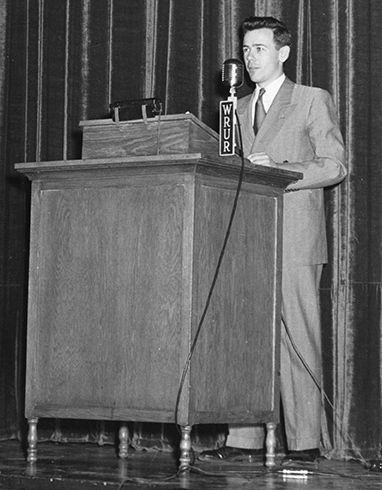 OPENING NIGHT: George McKelvey ’50, ’58 (MA) at the podium during WRUR’s first broadcast from Strong Auditorium. The World War II Navy veteran is widely credited with bringing college radio to Rochester.