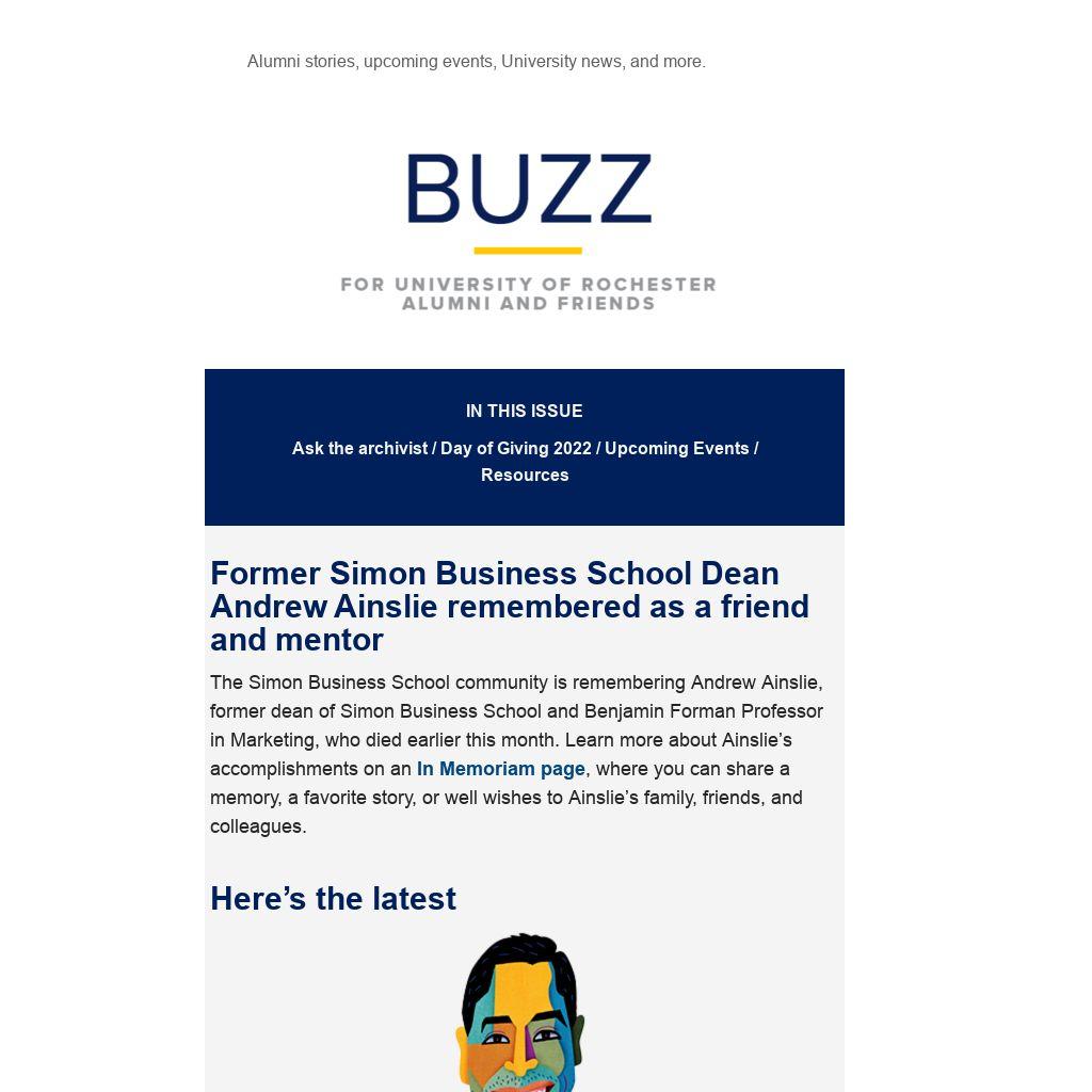 The Simon Business School community is remembering Andrew Ainslie, former dean of Simon Business School and Benjamin Forman Professor in Marketing, who died earlier this month. Learn more about Ainslie’s accomplishments on an In Memoriam page, where you can share a memory, a favorite story, or well wishes to Ainslie’s family, friends, and colleagues.