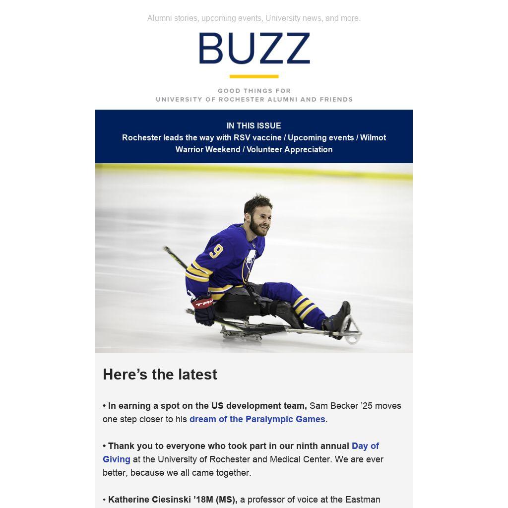 Copyright © University of Rochester, All rights reserved. Rochester Buzz is produced by the University of Rochester Office of Alumni Relations. View issues online at rochester.edu/alumni/buzz. Direct feedback and questions to rochesterbuzz@rochester.edu.