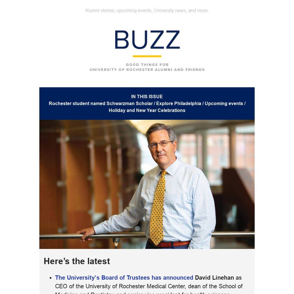 Rochester Buzz is produced by the University of Rochester Office of Alumni Relations. View issues online at rochester.edu/alumni/buzz. Direct feedback and questions to rochesterbuzz@rochester.edu.