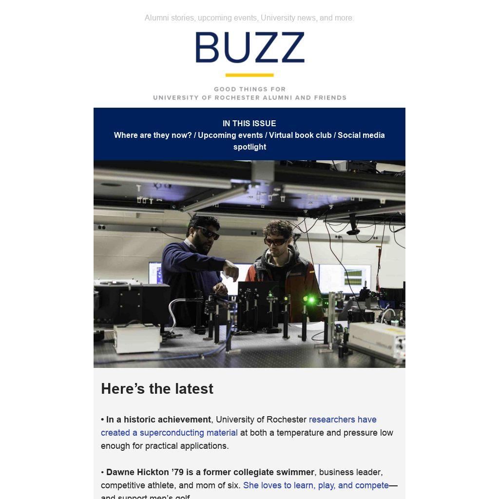 Copyright © University of Rochester, All rights reserved. Rochester Buzz is produced by the University of Rochester Office of Alumni Relations. View issues online at rochester.edu/alumni/buzz. Direct feedback and questions to rochesterbuzz@rochester.edu.
