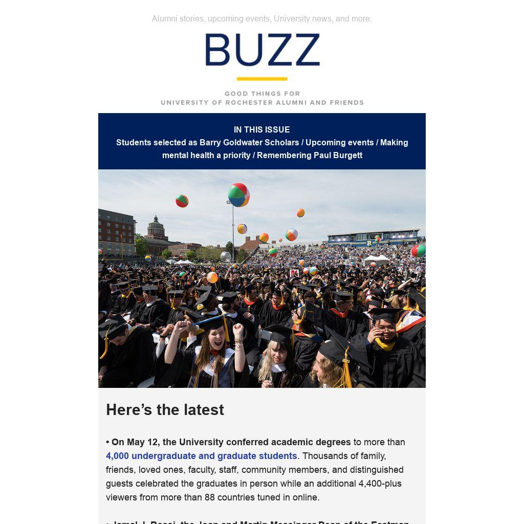 • On May 12, the University conferred academic degrees to more than 4,000 undergraduate and graduate students. Thousands of family, friends, loved ones, faculty, staff, community members, and distinguished guests celebrated the graduates in person while an additional 4,400-plus viewers from more than 88 countries tuned in online.