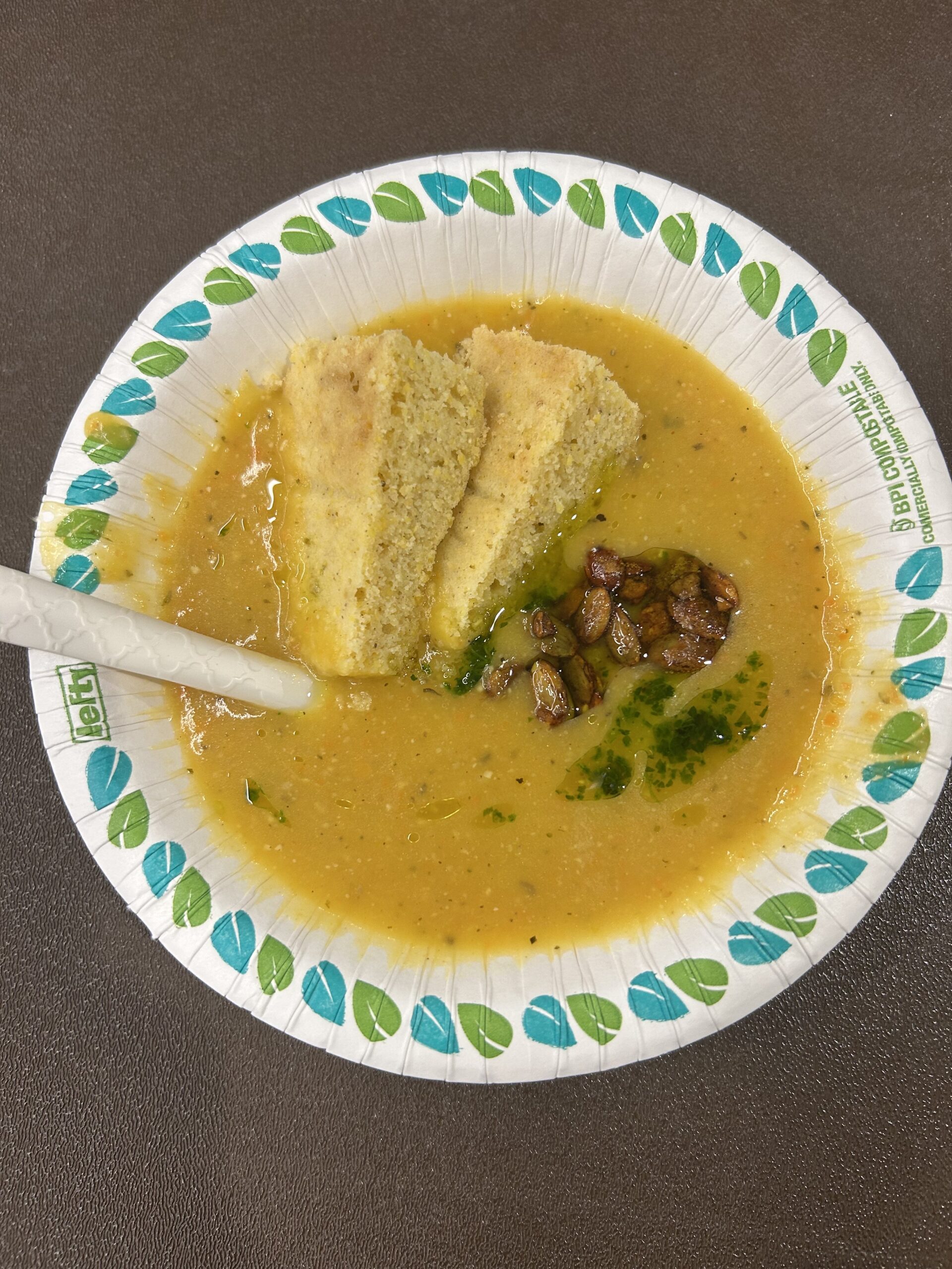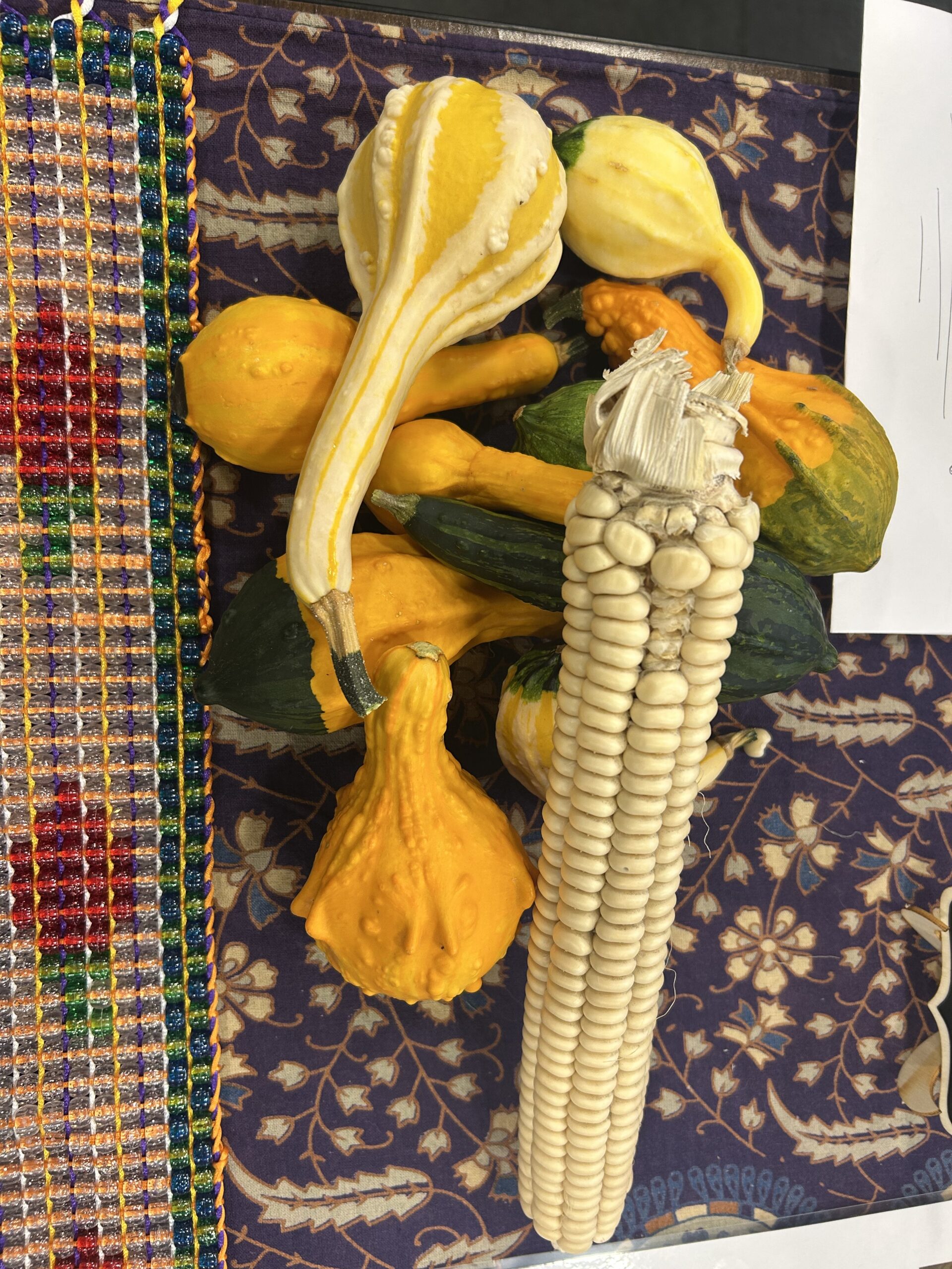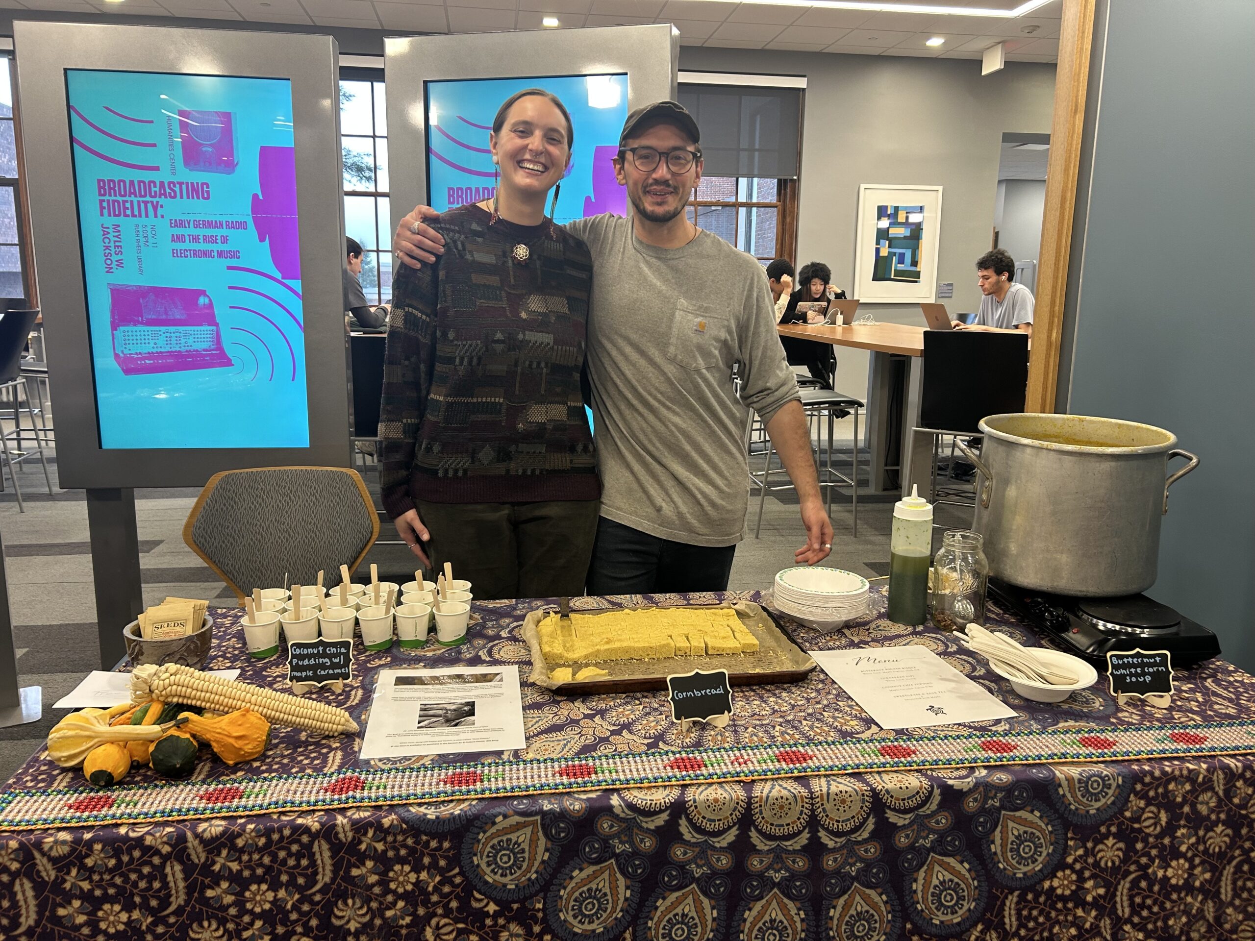 Refreshments prepared by Saul Schuster and Haley Christoff of Turtle Island Homestead added an additional layer to the event, highlighting the cultural significance of White Corn, a staple crop of the Haudenosaunee. Unlike sweet corn, White Corn is high in protein and has a lower glycemic index. Additionally, it can’t be eaten “green.” Rather, it needs to be dried out, shucked, and cooked in hardwood ashes to remove the hull. All of this is done by hand. Saul and Haley featured this staple crop in a butternut squash bisque with kernels of White Corn and cornbread, alongside a coconut chia pudding and sweetgrass and sage tea. Saul and Haley explained that White Corn represents resiliency, with heirloom seeds dating back at least 1,400 years in spite of European colonialist attempts to destroy the crop. “You destroy the crop, you destroy the people,” Saul said. Preserving and cooking with White Corn is a way of connecting with ancestors, past and present. Saul joked about meeting Haudenosaunee elders who will insist that they are making corn soup wrong! Everyone has their own recipes, which reveal personal and communal (hi)stories.