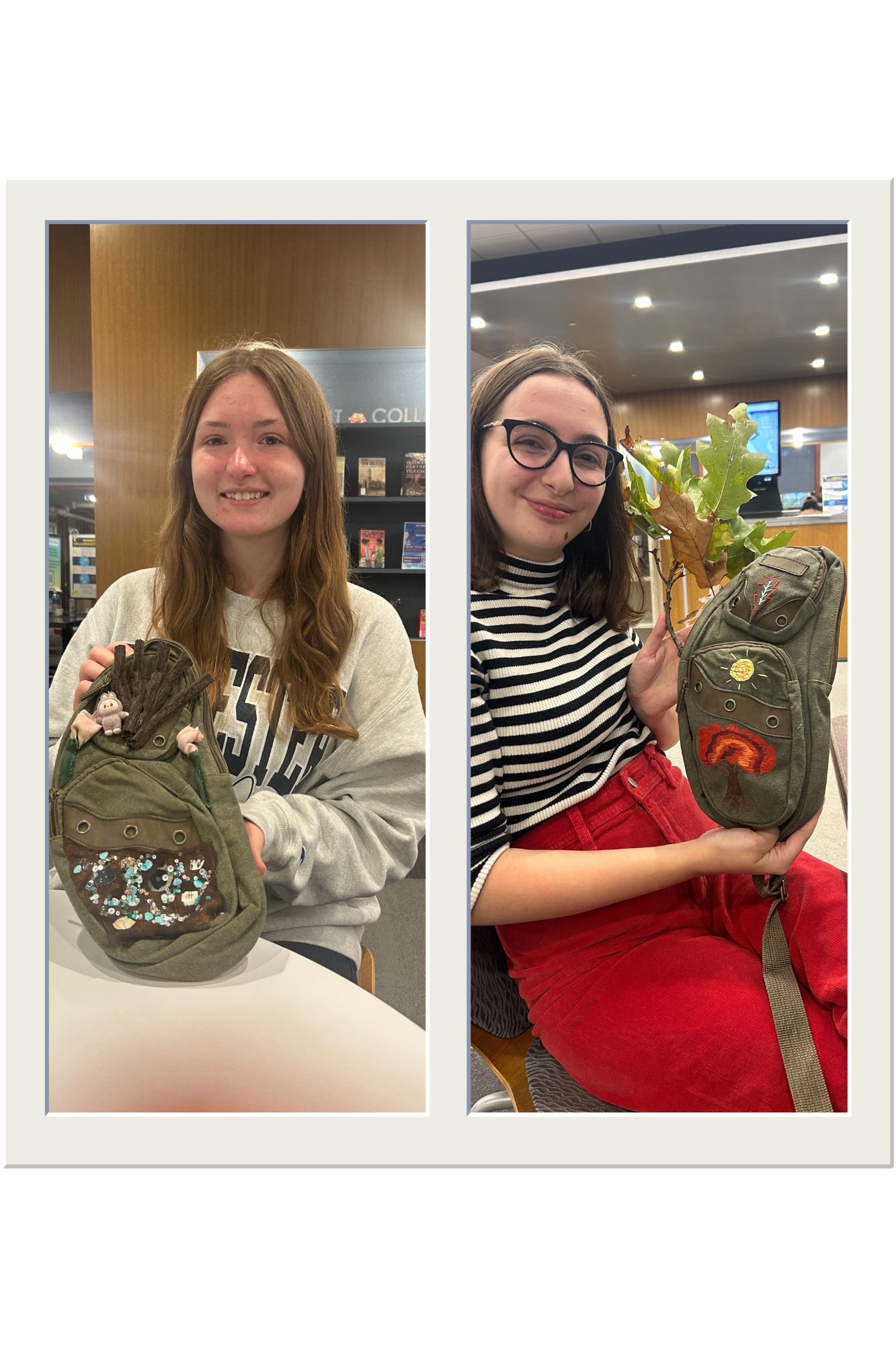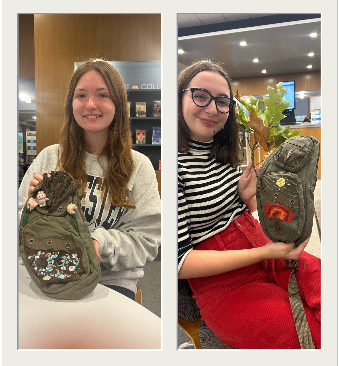 Through guided campus nature walks and embellishing canvas sling bags, students have the opportunity to develop their own relationship with these histories. For her project, Alexa Prouty ‘29 researched the environmental benefits of repurposing old buildings. On her sling bag, she paid homage to a dead tree that she saw on the guided walk with Trish. She learned that dead trees can be used as homes for animals, which she represented with a Labubu doll keychain. Far from detritus, the dead tree is still integral to the environment. This is in stark contrast with the human-made trash that pollutes the environment, which Alexa represented with glittery sequins at the bottom of the sling bag.