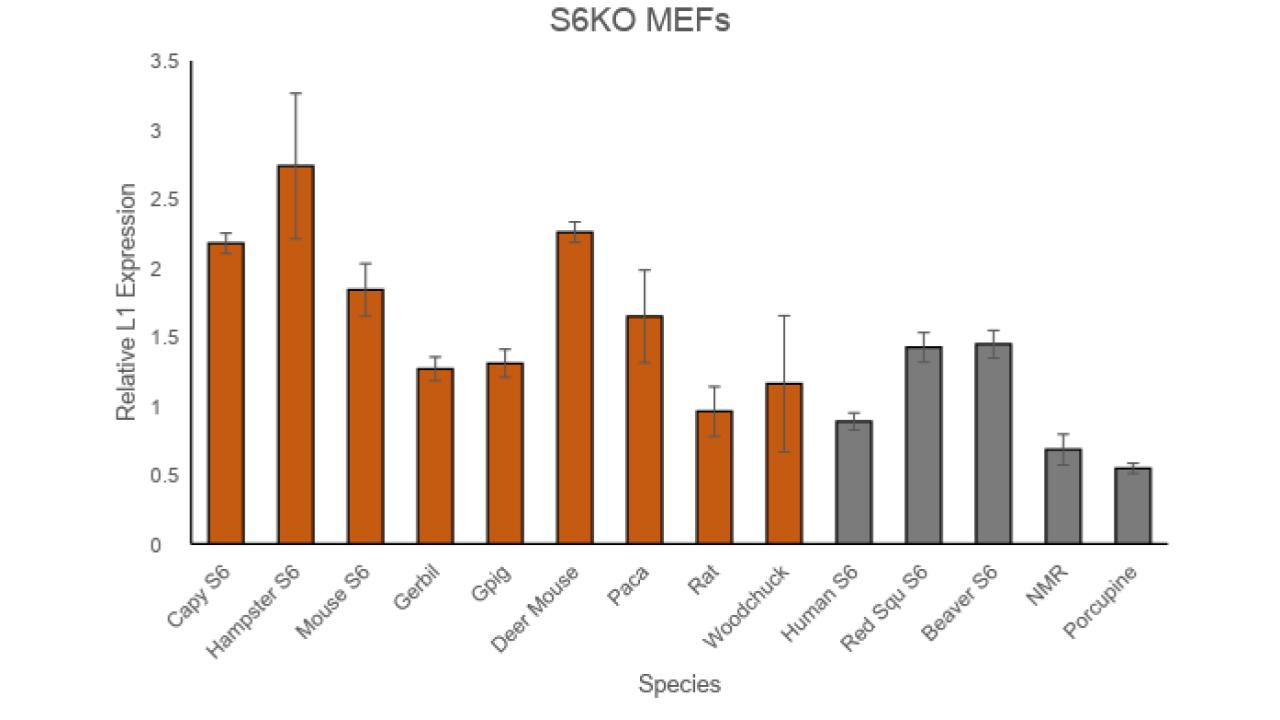 Figure 1.1: Results of qPCR on multiple species S6 plasmid incorporated into SIRT6 knockout MEF’s. Longer lived species are gray, and shorter lived species are rust color. NMR refers to the naked mole rat. The graph shows relative L1 expression once successful transfection of new species SIRT6 plasmid. Standard error bars included. Highest expression is in Hamster at around 2.75. Lowest expression is in Porcupine at around 0.6.