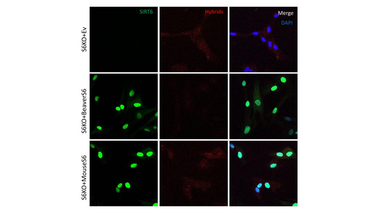 Figure 2.1: Previous experimental Immunofluorescence of mouse and beaver SIRT6 in S6 knockout mice. Beaver SIRT6 is more hyperphosphorylated than mouse and is better at repressing L1s IF for SIRT6, DNA/RNA hybrids, and DAPI in human fibroblasts knocked out for SIRT6. Top row is stably-transfected with either empty vector, or mouse SIRT6, shown by prevalence of staining. Mouse knockout shows less present SIRT6 (green) and prevalence of hybrid. (John Martinzed, unpublished)