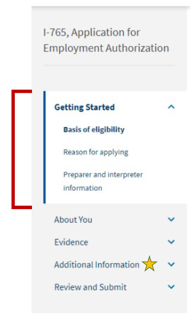 Step 3: Complete all sections of the I-765 online (as outlined below). You can save a draft of your application and finish at your own pace.
