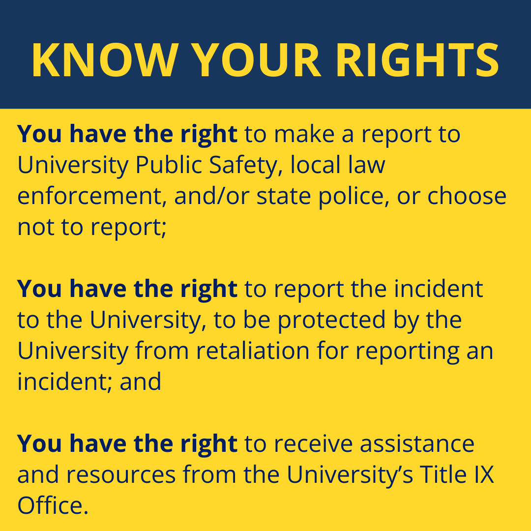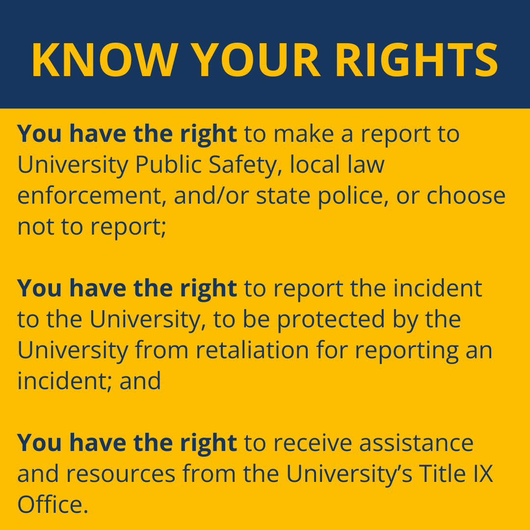 You can choose to simultaneously report to the University and the appropriate law enforcement agency for criminal investigation and response. You can also choose to only report the conduct to local law enforcement or only report to the University. You are encouraged to bring an advocate of your choosing to any meeting with Public Safety.